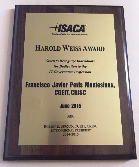 Javier Peris Premio Harold Weiss 2015 de ISACA por logros sobresalientes en Gobierno IT